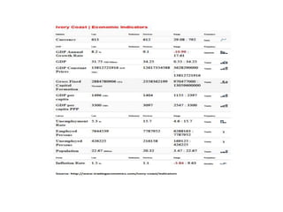 Ivory Coast achieved independence in 1960 and has experienced political instability including a coup in 1999 and civil wars between 2002-2007 and 2010-2011. It has since adopted a new constitution in 2000. Ivory Coast has seen strong economic growth in recent years at 8.5% in 2016, making it Africa's fastest growing economy, though nearly half the population still lives in poverty. The economy is booming with growth estimated at 9% in 2015 due to infrastructure investment and a return to stability and peace after past civil conflicts.