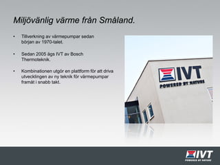 Vi på IVT Center ETV Energy Group har marknadens bredaste sortiment. Hos oss hittar du bergvärmepumpar, jordvärmepumpar, sjövärmepumpar, grundvattenvärmepumpar, luft/vattenvärmepumpar, luft/luftvärmepumpar och solvärmelösningar för både villor och fastigheter.