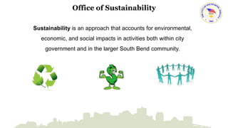 The document outlines the goals and initiatives of the Office of Sustainability in South Bend, Indiana. It discusses how sustainability accounts for environmental, economic, and social impacts. The Office of Sustainability works to strengthen the local economy, improve disaster resilience, promote social equity, and enhance quality of life. It also helps reduce city expenses and support community development through various programs like recycling, composting, and green infrastructure projects. The Office recognizes that community involvement is essential to the success of its programs and vision.