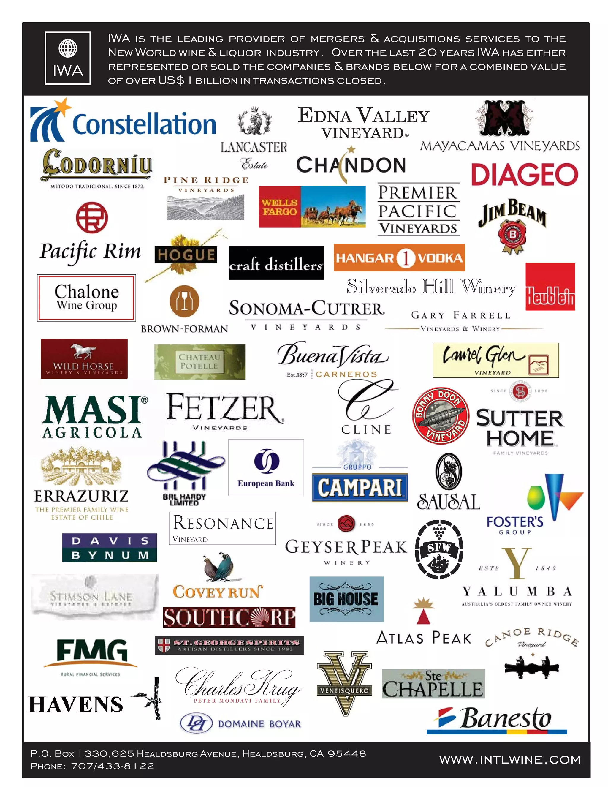 IWA is a leading provider of mergers and acquisitions services to the wine and liquor industry. Over the last 20 years, IWA has represented or sold companies and brands with a combined value of over $1 billion. Recently, IWA represented Silverado Hill Winery in its sale to Laird Family Estates, represented Mayacamas Vineyards in its sale to a private investor group, and represented Resonance Vineyard in its sale to Louis Jadot.