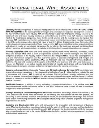 IWA is the leading provider of mergers and acquisitions services to the New World wine and liquor industry. Over the last 20 years IWA has represented or sold companies and brands with a combined value of over US$1 billion. IWA has extensive experience advising and representing both buyers and sellers in M&A transactions in the wine and liquor industry globally.