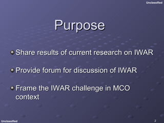 The document discusses the characteristics and strategies of irregular warfare (IW), contrasting it with regular warfare and highlighting the challenges it poses to conventional military operations. It emphasizes the adaptability of adversaries who utilize guerrilla warfare, propaganda, and terrorism to erode the strengths of nation-state militaries. Additionally, it identifies the necessity for military organizations to understand and engage with the cognitive domain to effectively counter IW threats and improve their operational capabilities.