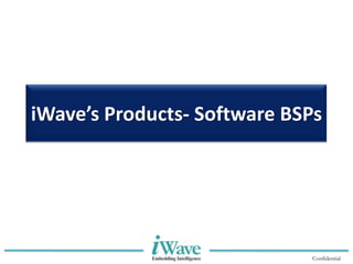 This document discusses iWave Systems' products and services related to embedded software development. It describes iWave's expertise in developing board support packages (BSPs) for various operating systems including Windows Embedded Compact 7, Embedded Linux, Android, and others. It also lists iWave's driver development experience and capabilities across domains like storage, display, multimedia, wireless technologies and more. Product details are provided for some of iWave's BSP offerings for Freescale platforms like i.MX6, i.MX53 and Sabre boards.