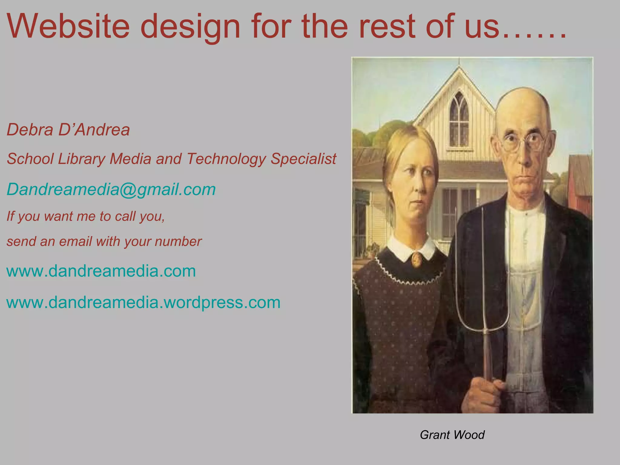 The document discusses using iWeb to create and publish personal websites. It provides an overview of early website design using HTML and CSS. It then covers WYSIWYG editors and common applications like Adobe Dreamweaver and Microsoft FrontPage. The basics of website design like domain names, hosting, and site organization in iWeb are explained. Templates, media insertion, hyperlinks, and publishing are also covered. Resources for templates, tutorials, and examples of iWeb sites are listed.