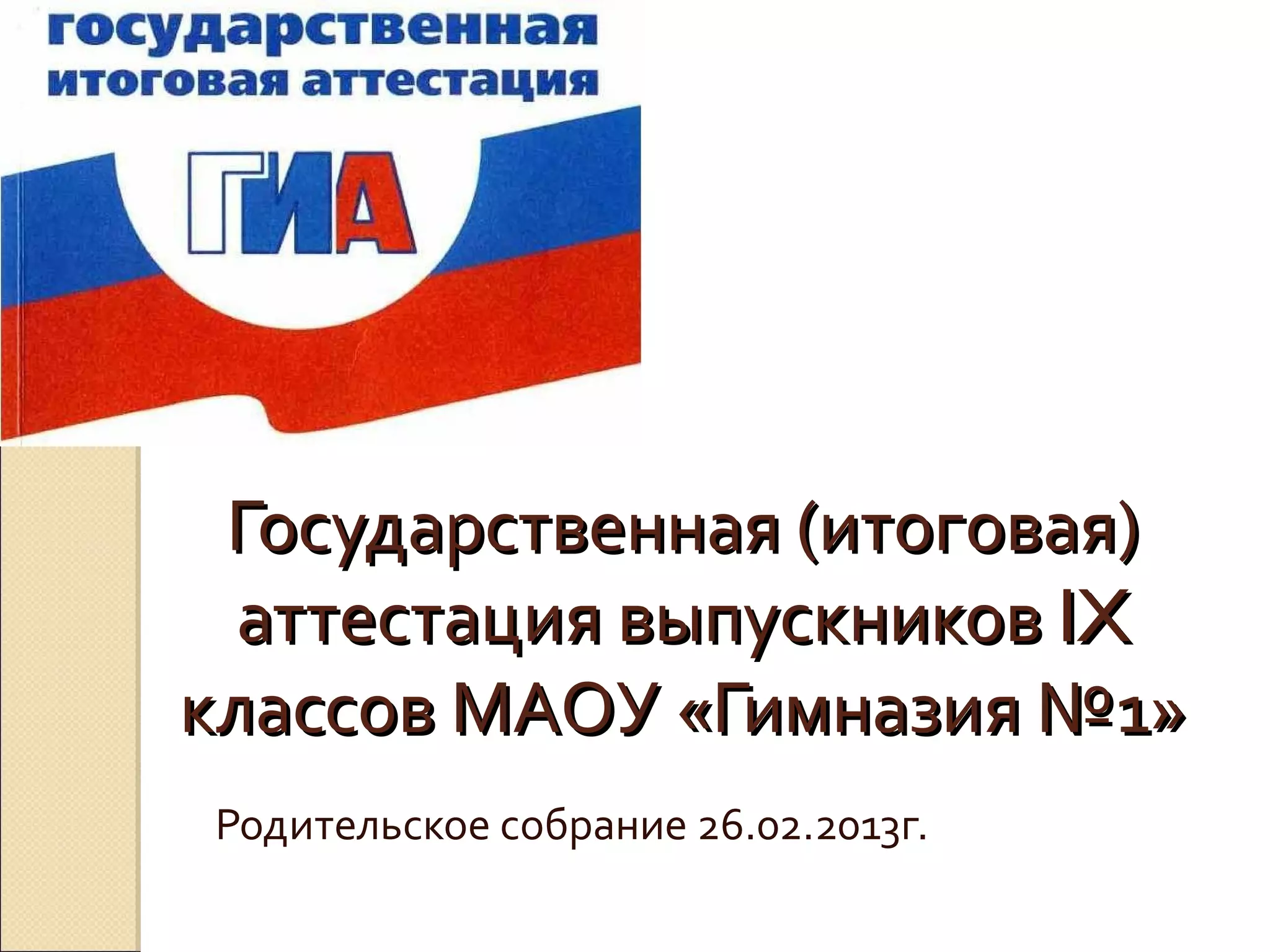 Документ описывает порядок проведения государственной итоговой аттестации выпускников IX классов в 2013 году в гимназии No1 города Саратова. Аттестация включает обязательные экзамены по русскому языку и математике, а также два экзамена по выбору, с четко установленными датами и правилами допуска. Также предусмотрены правила по апелляции и возможности повторного участия в аттестации для обучающихся с неудовлетворительными результатами.