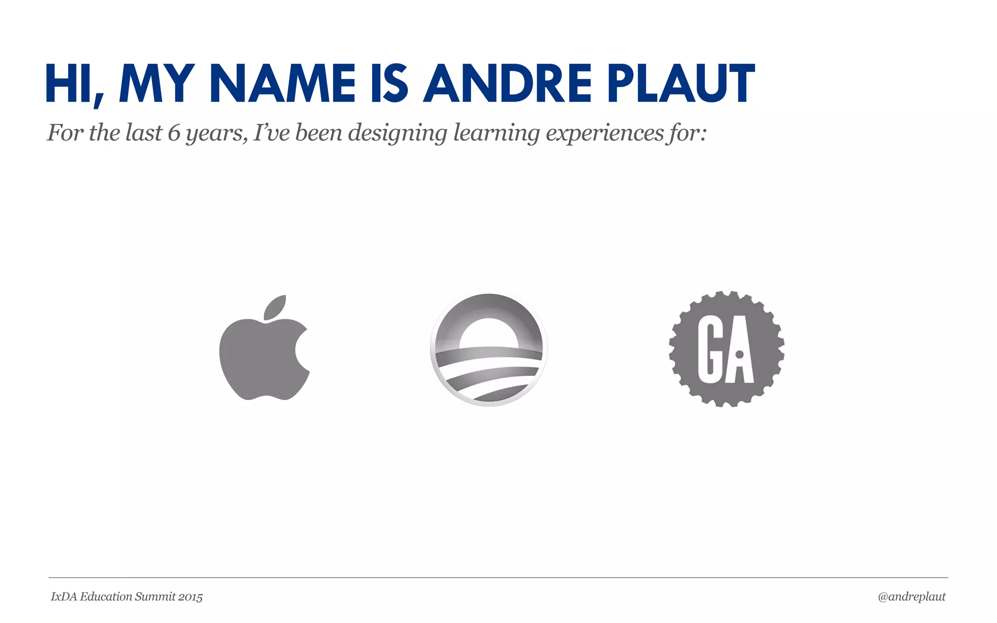 Andre Plaut gave a presentation about designing learning experiences. He discussed the elements of learning design, including curriculum, content, interface, delivery and experience. He described the progression of a learning experience from relevance to application. He explained how UXDI, a user experience design institute, was built using a consistent global structure but regional flexibility. The presentation outlined UXDI's curriculum, workshops, projects and feedback process to provide life-changing learning experiences to help people find work they love.