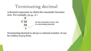 This document provides learning objectives and content about rational and irrational numbers for a Class 9 mathematics lesson. It begins by defining different types of numbers - natural, whole, integers, rational, and irrational - and provides examples. It then explains rational numbers as those that can be written as fractions p/q, and irrational numbers as those that cannot be expressed as fractions. Various methods are provided for representing and finding rational numbers between two given rational numbers, as well as representing irrational numbers on the number line. Finally, the document discusses operations involving rational and irrational numbers.