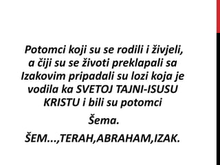 Izak, sin Abrahama, rođen je 1918.g.p.n.e. i oženio se Rebekom, s kojom je imao blizance Ezava i Jakova. Jakov je postao nositelj božje loze koja vodi do Isusa Krista, a Izak je patio zbog gubitka svog sina Josipa. Umro je 1738.g.p.n.e. u dobi od 180 godina.