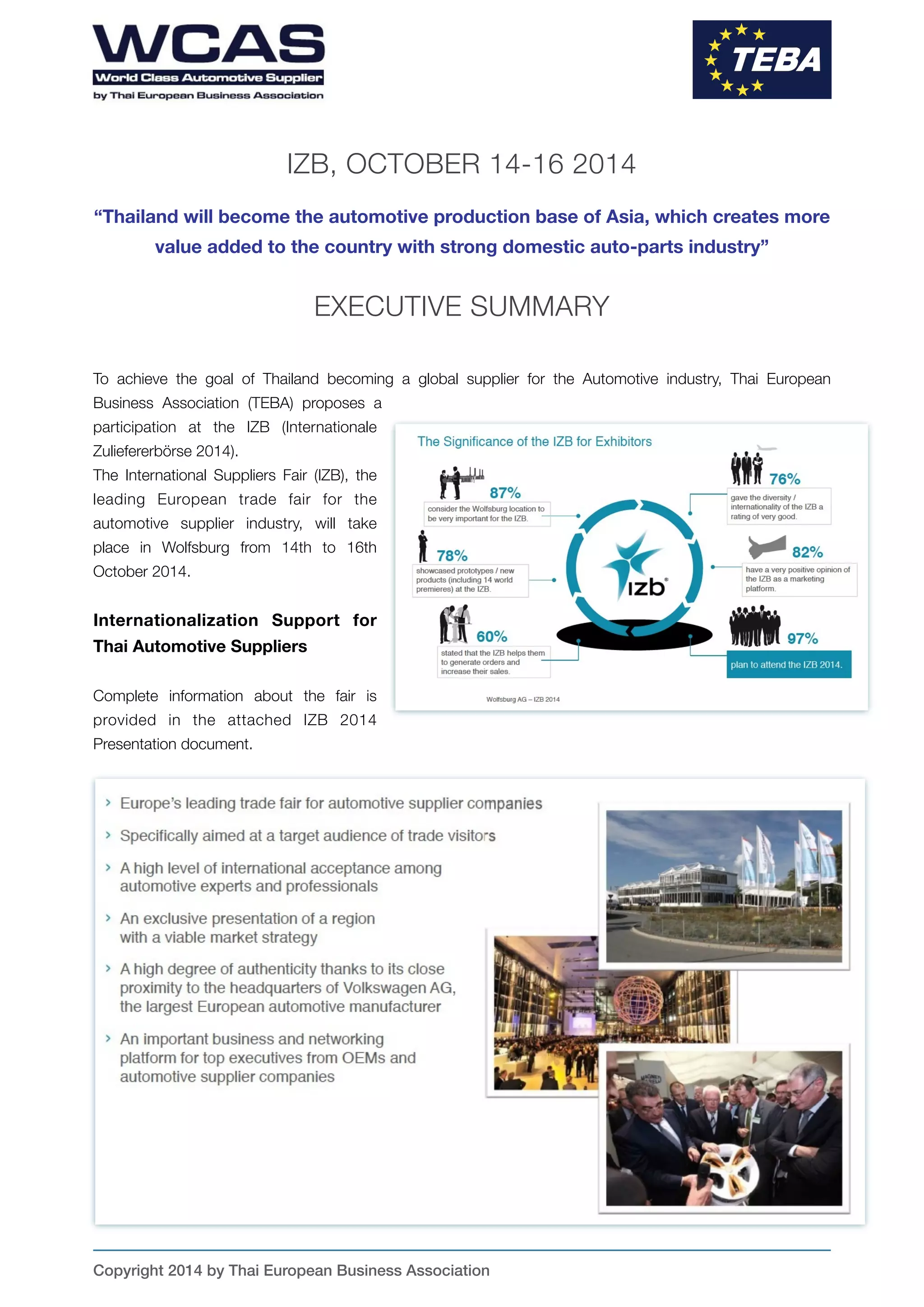 The Autobook International Pavilion at the IZB 2016 in Wolfsburg, Germany, allows participants to connect with Volkswagen, other OEMs, and 750 global suppliers from October 18-20, 2016. Booth reservations close on September 7, 2016, with several exhibition packages available to cater to different needs. The event serves as a vital networking platform for automotive professionals, featuring one-on-one business matchmaking meetings and various promotional opportunities.
