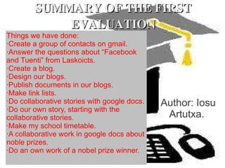 The document summarizes the work done for a first evaluation assignment: