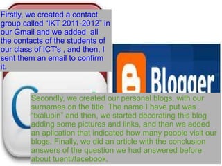 1) Students created a Gmail contact group and blog sites to publish documents.