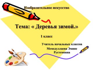 Документ касается урока изобразительного искусства для 1 класса на тему 'деревья зимой'. Учитель Эмине Рустемовна использует стихотворение Пушкина для создания атмосферы зимы и предлагает детям рисовать деревья и кустарники. В конце документа подводится итог о работе детей и выражается благодарность за внимание.