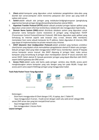 Dokumen ini menjelaskan pengertian jaringan komputer, termasuk komponen utama seperti server, client, dan protokol jaringan. Manfaat jaringan komputer meliputi berbagi sumber daya, komunikasi yang lebih baik, dan keamanan data. Selain itu, dokumen juga menjelaskan langkah-langkah untuk membangun jaringan sederhana menggunakan berbagai alat dan pengaturan dalam aplikasi Packet Tracer.