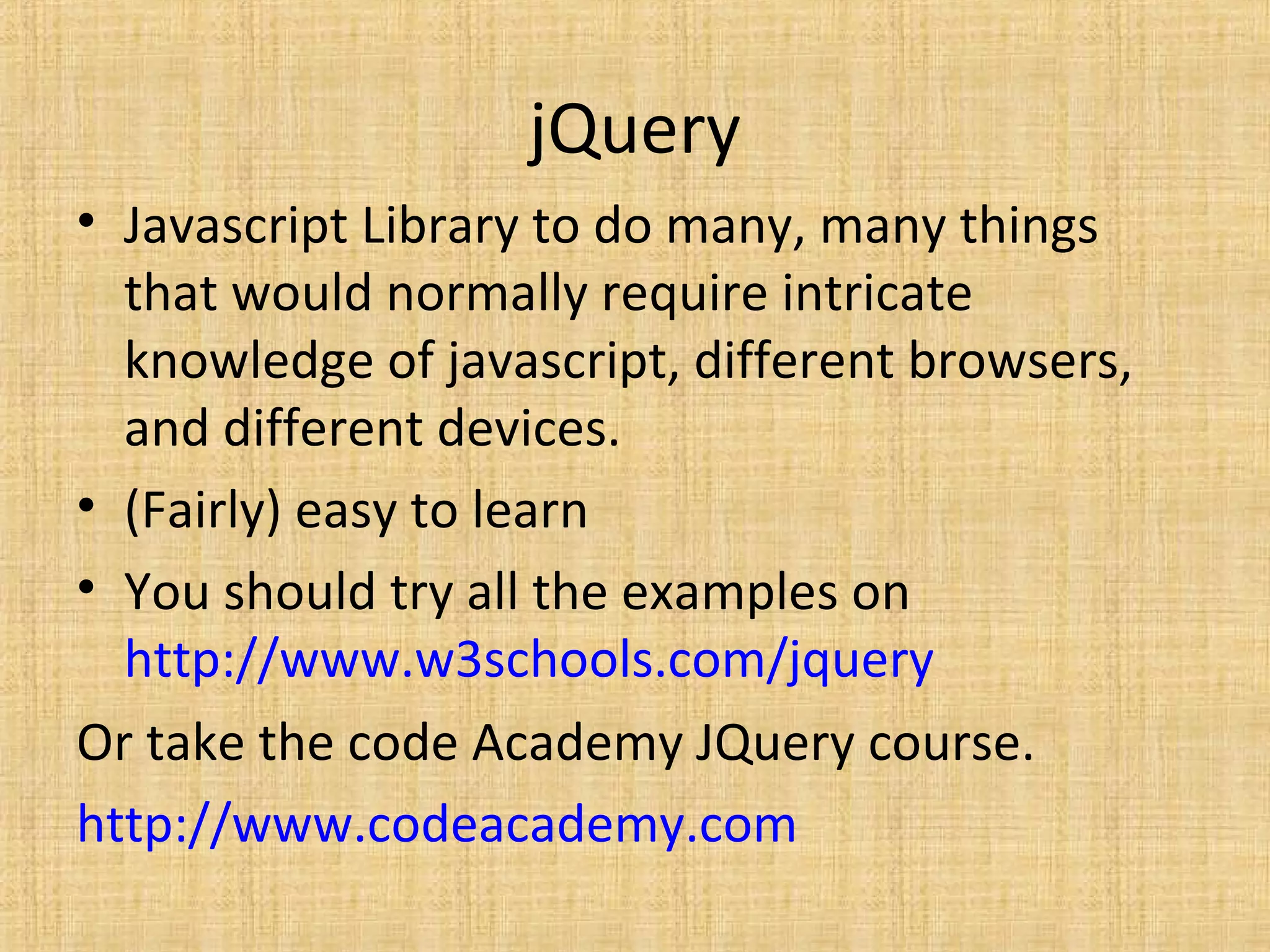 jQuery is a JavaScript library that makes it easier to select and manipulate HTML elements and implement animations and AJAX requests. It works by using CSS selectors to select elements and then provides methods to hide, show, add or remove content from those elements. Some key features of jQuery include selecting elements, modifying CSS styles, handling events, animating properties and AJAX requests. The document provides examples of how to select elements, bind events, implement common animations and effects like fading and sliding, and manipulate HTML content.