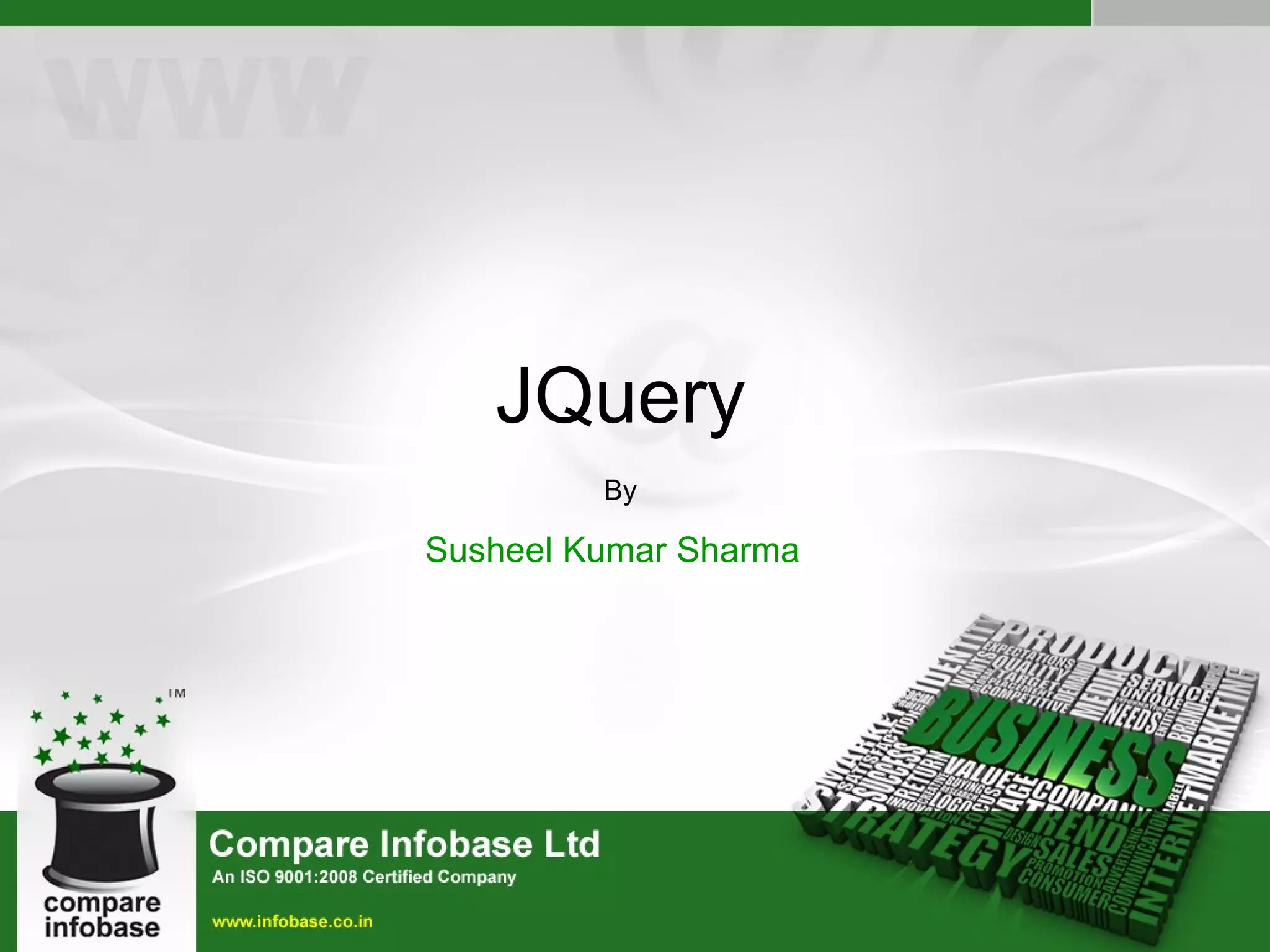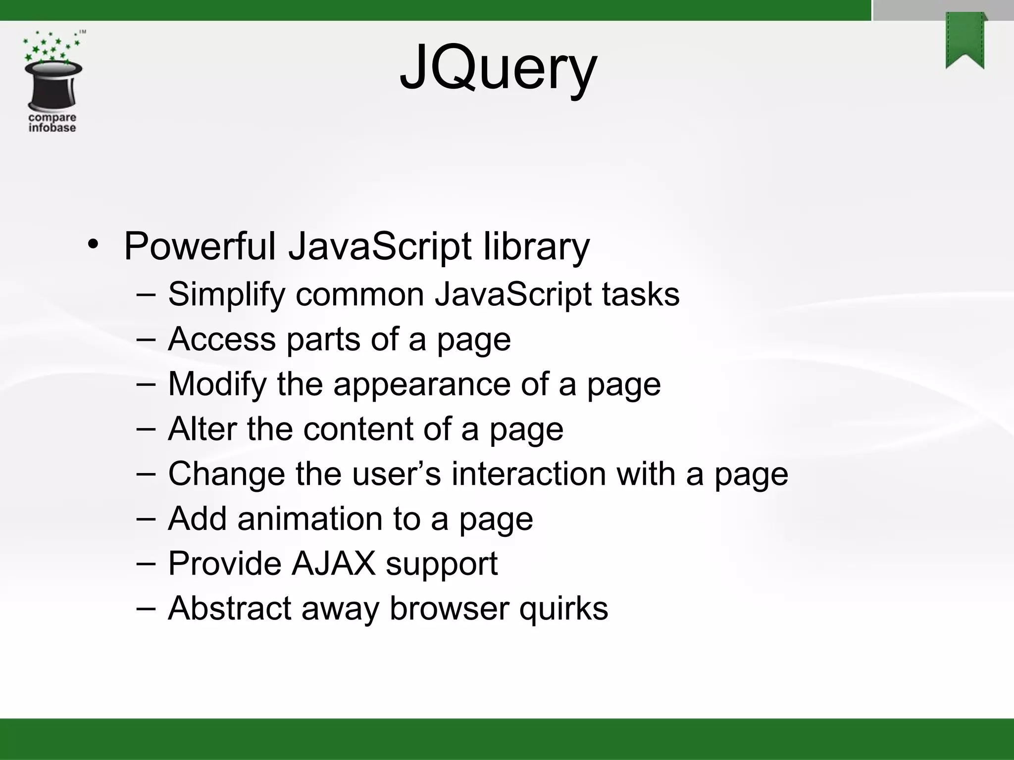 The document discusses jQuery, a JavaScript library that simplifies common tasks like accessing and modifying elements on an HTML page. It covers how jQuery interacts with the DOM and allows selecting elements, modifying styles and content, and handling events. The document also provides examples of how jQuery can be used to make AJAX requests to retrieve and display external data without reloading the page.