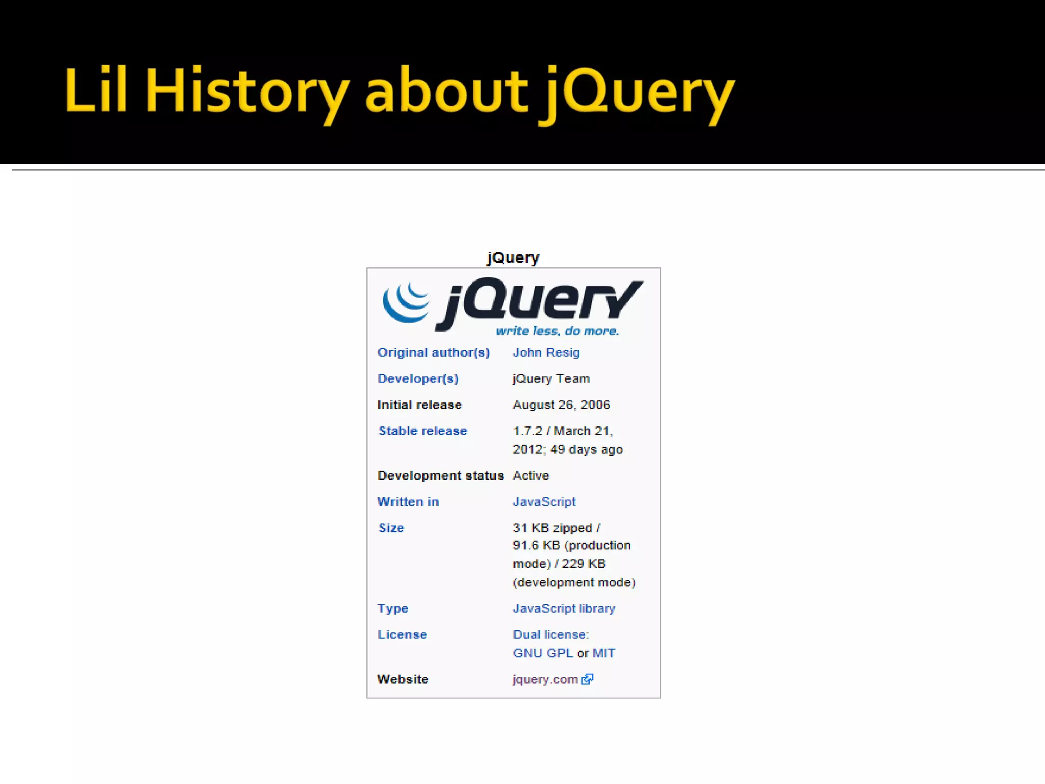 The document discusses jQuery, a JavaScript library. It provides information on: