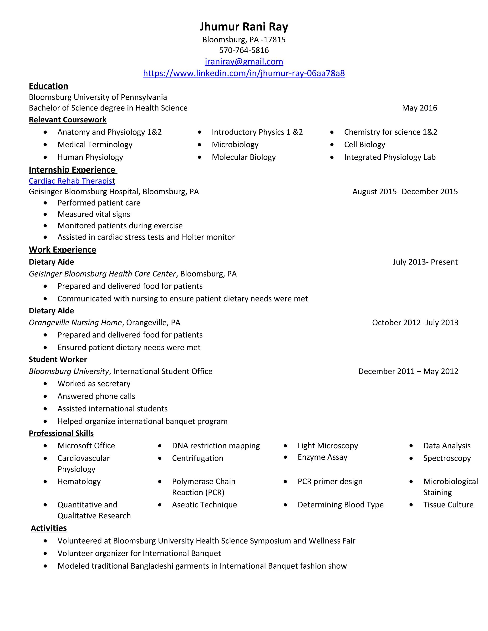 Jhumur Rani Ray graduated from Bloomsburg University of Pennsylvania with a Bachelor of Science degree in Health Science. She has experience as a cardiac rehab therapist intern at Geisinger Bloomsburg Hospital where she performed patient care and monitored patients during exercise. Currently, she works as a dietary aide at Geisinger Bloomsburg Health Care Center and Orangeville Nursing Home, preparing and delivering food while ensuring patient dietary needs are met. Her skills include Microsoft Office, laboratory techniques, cardiovascular physiology, and research methods.