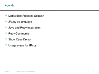 The document discusses the integration of JRuby, an implementation of Ruby for Java, into Java projects, emphasizing its benefits such as powerful language features, ease of communication with operating systems, and a strong community supported by Ruby on Rails. It outlines how JRuby can simplify various tasks including build management, integration testing, and API communication, and encourages developers to leverage Ruby's expressive syntax over traditional Java tools like Ant and Maven. The presentation highlights the advantages of using JRuby for scripting, project setup, and enhancing developer productivity within Java environments.