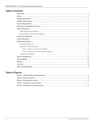 This document discusses configuring and deploying the chassis cluster feature on Juniper Networks J Series services routers to provide high availability. It describes the hardware and software requirements, feature overview, configuration, monitoring, deployment scenarios including active/passive and active/active, special considerations, and upgrade process. The chassis cluster allows two J Series routers to work as a single device, increasing redundancy and reliability.