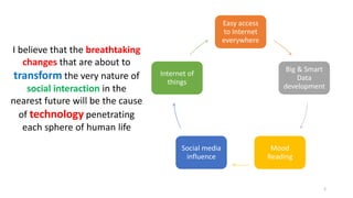 The document discusses the future of social interaction influenced by technology, predicting a highly interconnected world by 2025 where internet access and IoT devices will permeate daily life. It highlights the role of big data and personalized marketing in shaping consumer experiences, as well as the potential of mood reading technology to enhance communication and commercial strategies. The document concludes with a caution about the risks and responsibilities that come with digital advancements, emphasizing the need for individuals to maintain their identity amidst rapid technological changes.