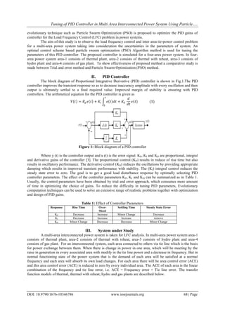This document summarizes a study that optimizes PID controller parameters for load frequency control in a four-area interconnected power system using particle swarm optimization. The four-area system includes thermal, thermal with reheat, hydro, and gas power plants. PID controllers are used for each area. Particle swarm optimization is used to minimize the integral of squared error performance index by optimizing the PID parameters. Simulation results in MATLAB/Simulink demonstrate improved regulation of frequency deviations and tie-line power flows with the optimized PID controllers.