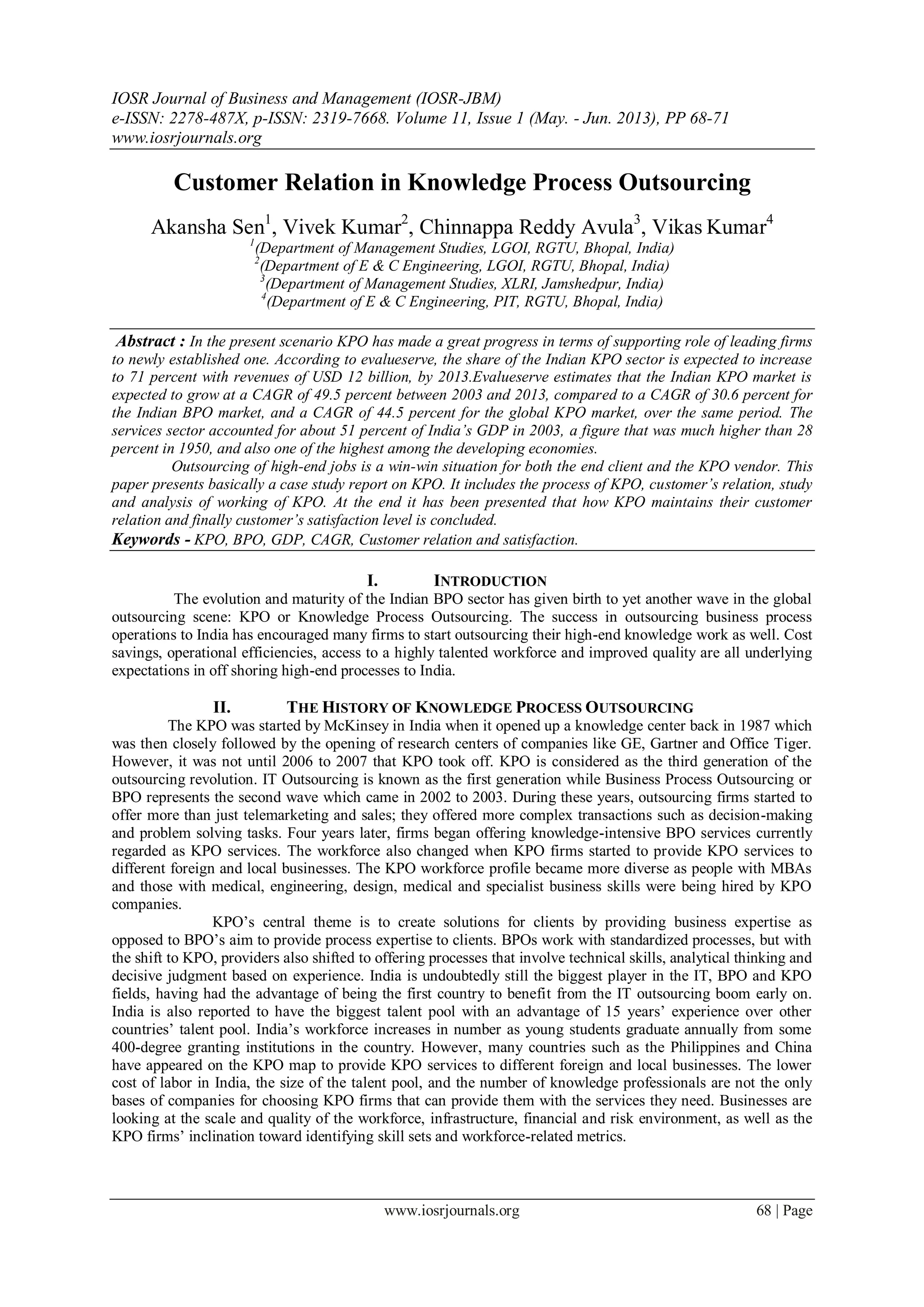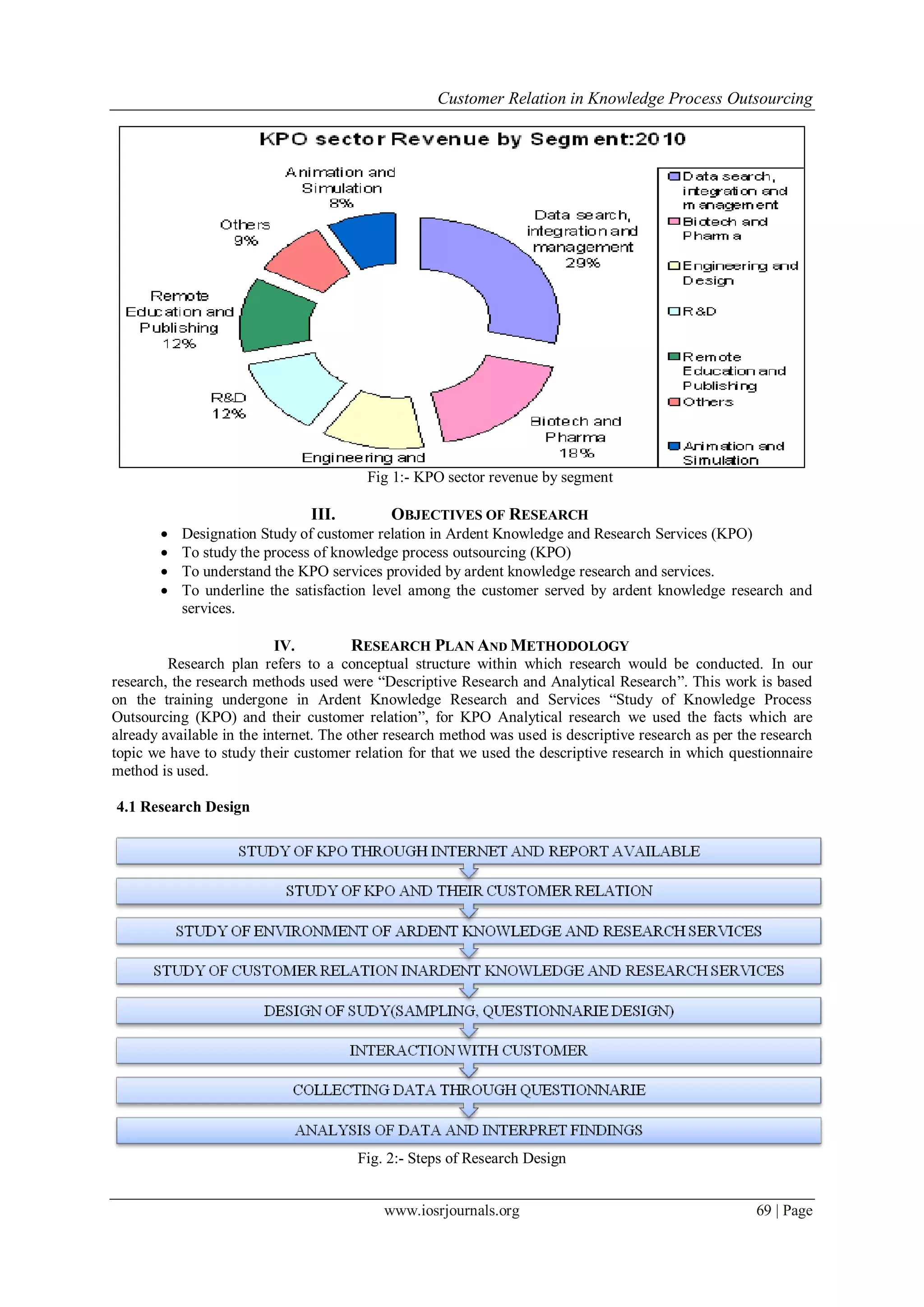 The document discusses the growth and significance of Knowledge Process Outsourcing (KPO) in India, highlighting its expected revenue increase and market share. It presents a case study on customer relations within KPO, focusing on service satisfaction and areas for improvement based on customer feedback. The paper concludes with recommendations for enhancing service quality, transparency, and advertising strategies to boost customer satisfaction.