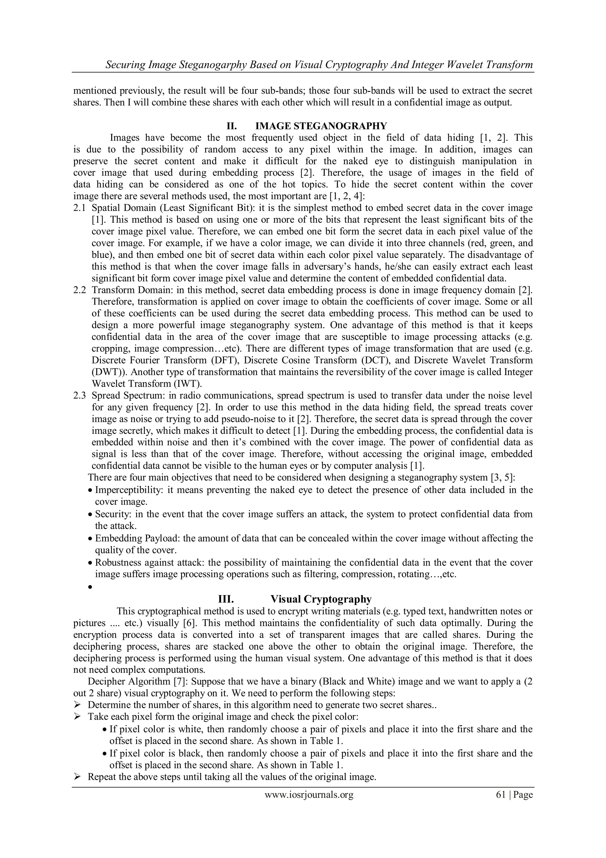 The document proposes a new method for securing image steganography using visual cryptography and integer wavelet transform. The method embeds a secret image into a cover image in the following steps: 1) Apply (2 out of 2) visual cryptography to the secret image to generate two secret shares. 2) Apply a two-level integer wavelet transform to the blue channel of the cover image, resulting in four sub-bands. 3) Embed each secret share into one of the four sub-bands. 4) Combine the channels to generate the stego-image. Extraction requires applying the same transforms to the stego-image to recover the secret shares and reconstruct the secret image, without needing the original cover image. The method