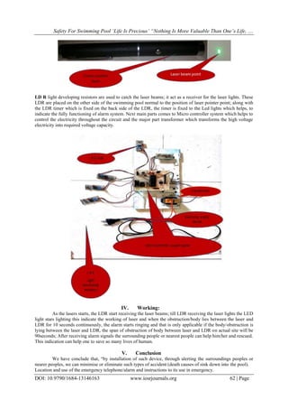 This document discusses safety measures for swimming pools. It proposes installing a laser safety device around swimming pools to prevent accidents. The device would use lasers, light detectors, and a microcontroller system. Lasers would be placed around the pool and light detectors on the opposite side would detect if a person blocks the laser for 10 seconds, triggering an alarm to alert others. This system could minimize deaths from people sinking in deep areas of pools without being noticed. A risk assessment is important to identify hazards and control risks at pools. Signage and emergency equipment are also important for pool safety.