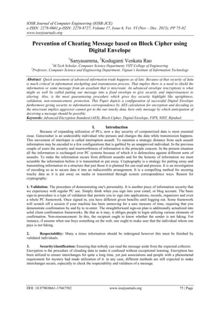 This document proposes a method for preventing cheating of messages based on block cipher using a digital envelope. It begins with an introduction to the need for data security during storage and transmission. It then discusses the AES encryption algorithm and related work involving encryption for wireless devices. The proposed method uses AES key expansion techniques to generate multiple keys for encryption and decryption of messages using a digital envelope, packing the encrypted message and key into a single packet. It claims this prevents attackers from accessing sensitive data. Future work could expand this to image encryption and decryption applications.