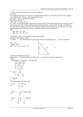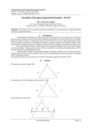 The document presents a new formula for calculating the area of an isosceles triangle, developed by the author using the Pythagorean theorem. It includes detailed explanations, examples, and verifications to support the formula's validity. The formula is proposed to be useful in educational settings and practical applications such as land measurement and construction.