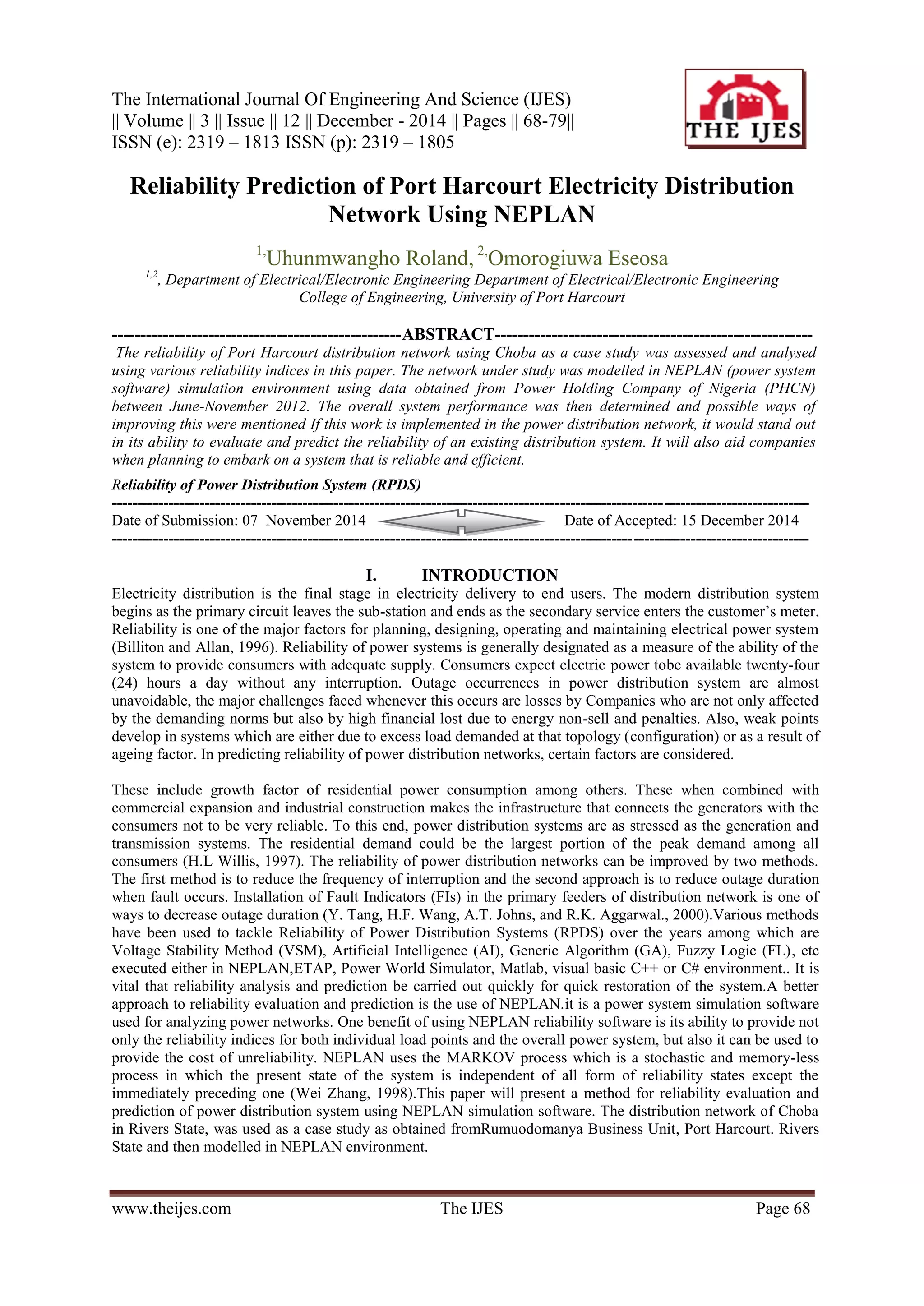 The paper assesses the reliability of the Port Harcourt electricity distribution network using NEPLAN simulation software, modeling data from Power Holding Company of Nigeria between June and November 2012. It discusses various reliability indices and methods to improve system performance, emphasizing outage frequency and duration reduction. The study aims to enhance the power distribution network's reliability and guide companies in planning efficient and reliable systems.