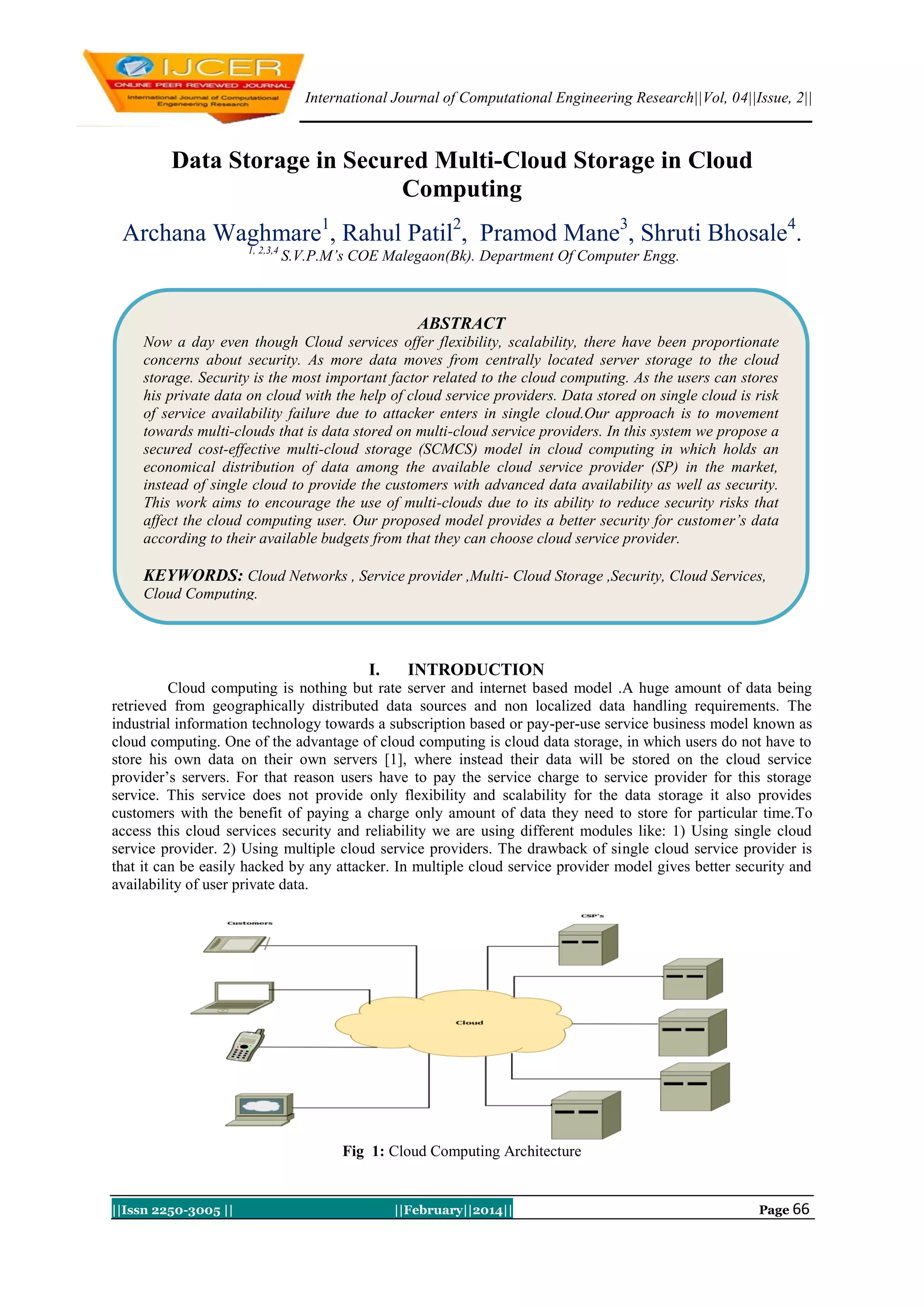 The document summarizes a proposed model for secured multi-cloud storage in cloud computing. The model divides user data into pieces that are distributed across multiple cloud storage providers. This prevents any single provider from accessing meaningful user data, improving security and availability. The model uses algorithms like Shamir secret sharing to split data and MD5 hashing to check data integrity upon retrieval. The goal is to provide improved security, availability, and cost-effectiveness over single cloud storage.