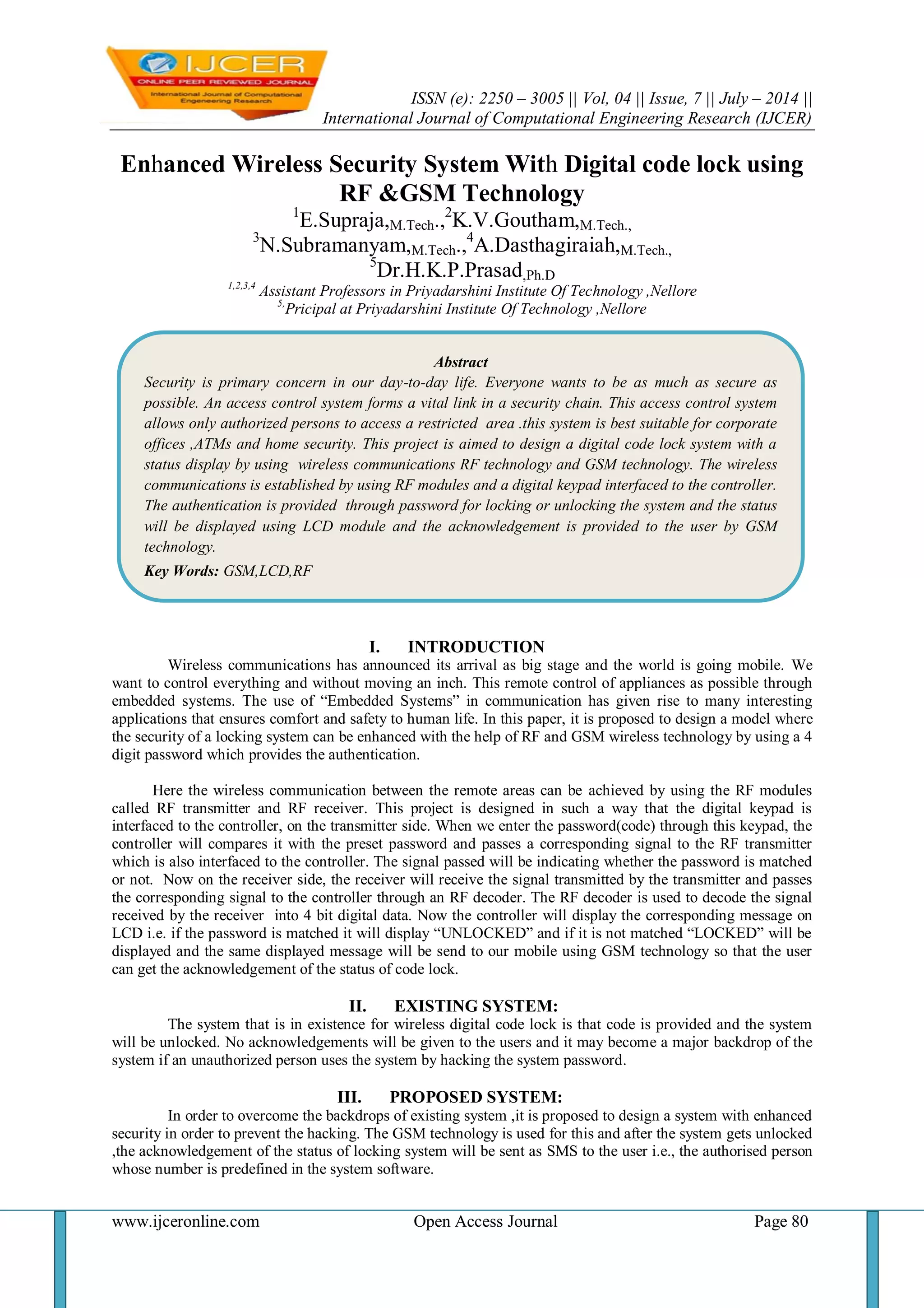 The document outlines a proposed enhancement to wireless security systems through the integration of RF and GSM technology, focusing on a digital code lock mechanism requiring a 4-digit password. It describes the existing system's limitations and presents a design that includes user notifications via SMS upon unlocking or unauthorized access attempts. The system is aimed at improving security in various applications, including corporate offices and home security, with future developments suggesting the incorporation of facial recognition for access control.