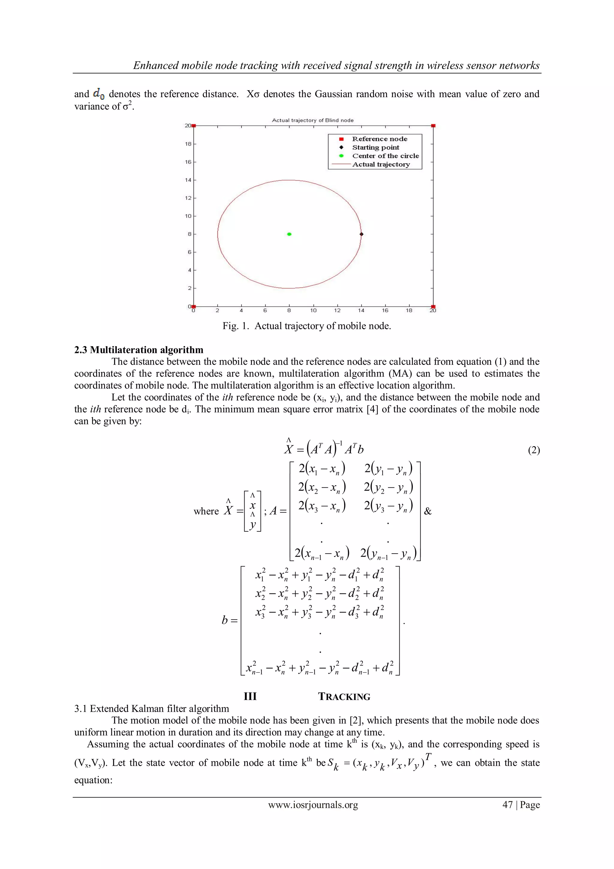 This document presents a study on enhanced mobile node tracking within wireless sensor networks (WSN) using received signal strength (RSS) and an extended Kalman filter (EKF). It discusses various localization techniques, focusing on multilateration algorithms to estimate mobile node positions and comparing the performance of different filtering methods. The proposed enhancements to the EKF show improved accuracy and convergence speeds for tracking mobile nodes in complex environments.