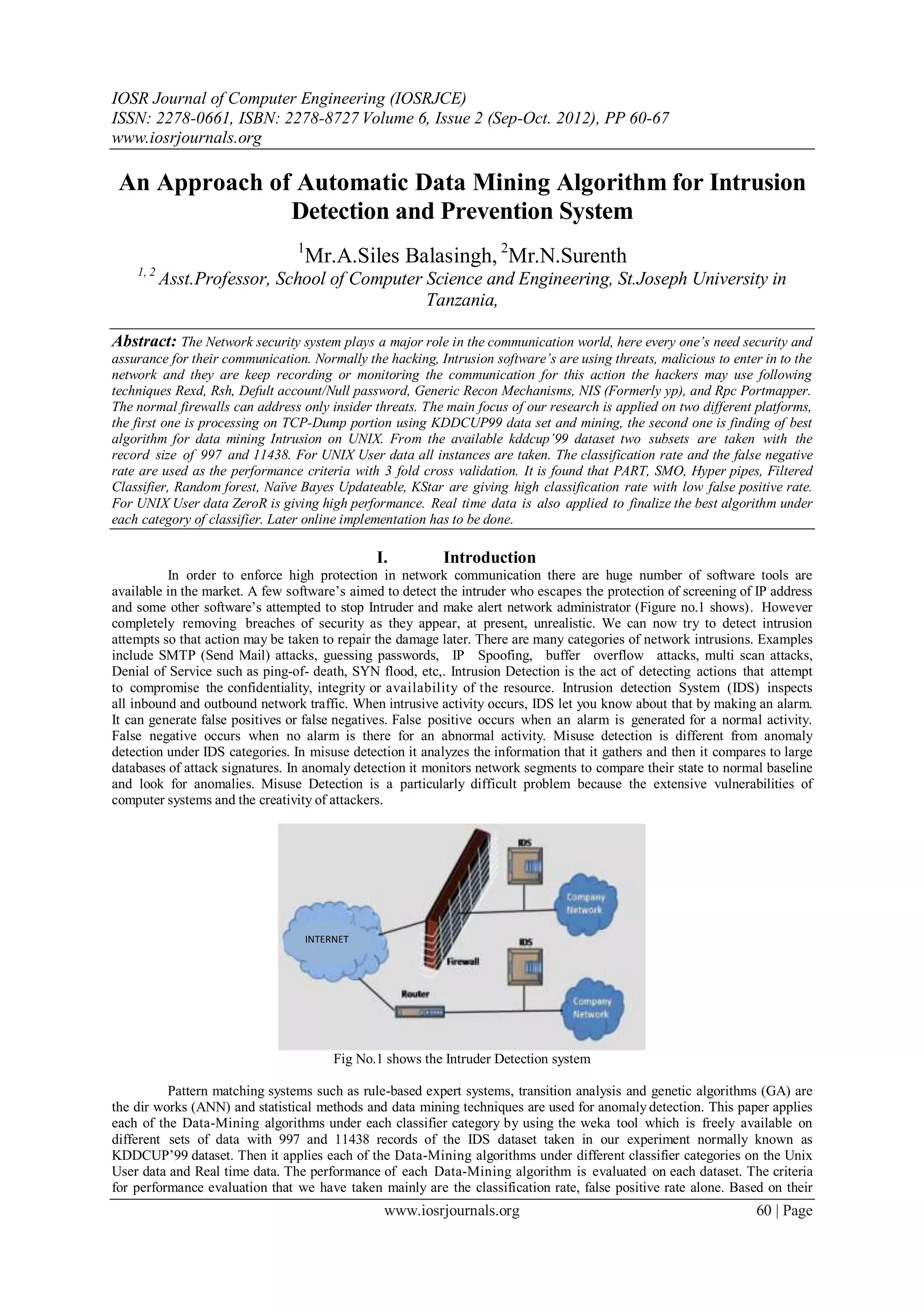 This document summarizes an approach for using data mining algorithms to detect network intrusions and prevent security threats. It analyzes two datasets - one containing 997 records and another containing 11,438 records - using various classification algorithms in Weka to determine the best performing ones. The algorithms examined include PART, SMO, HyperPipes, Filtered Classifier, Random Forest, Naive Bayes Updateable and KStar. Classification rate and false positive rate are used to evaluate performance. The document also discusses related work on intrusion detection using neural networks, genetic algorithms and other approaches.