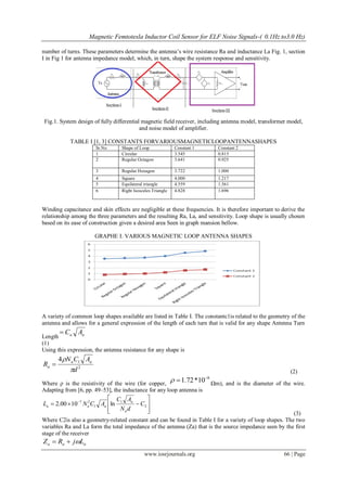 This document describes the design of a magnetic field sensor to detect extremely low frequency (ELF) noise signals between 0.1 Hz to 3 Hz. It discusses the design of the loop antenna, transformer, and amplifier components. The antenna design aims to achieve optimal sensitivity while balancing factors like size, weight and resistance. A transformer is used to electrically isolate the antenna and match its impedance to the amplifier. Design considerations are provided to achieve a flat frequency response between the transformer's lower and upper cutoff frequencies. The overall system sensitivity depends on the transformer turn ratio and balancing the amplifier's voltage and current noise sources.