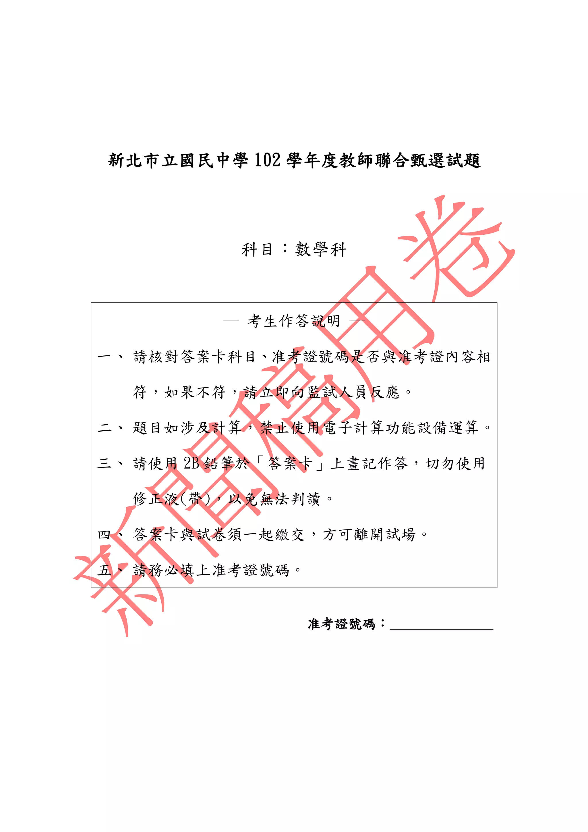 该文档为新北市立国民中学102学年度教师联合选拔考试的数学科试题,包括考试注意事项和多道选择题。考试要求考生使用2B铅笔填涂答案,不得使用电子计算器,并提交答案卡与试卷。试题涵盖各种数学知识,包括概率、几何和代数等,评分共计100分。