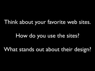 The document provides an overview of key principles of web design including keeping designs simple, prioritizing the user experience, using grids and standard ad sizes, and analyzing site architecture, usability, design, and content. It discusses designing for how people use the web by scanning and being impatient. Readability, findability, and usability are important to consider. The design process involves sketching wireframes and mockups before coding.