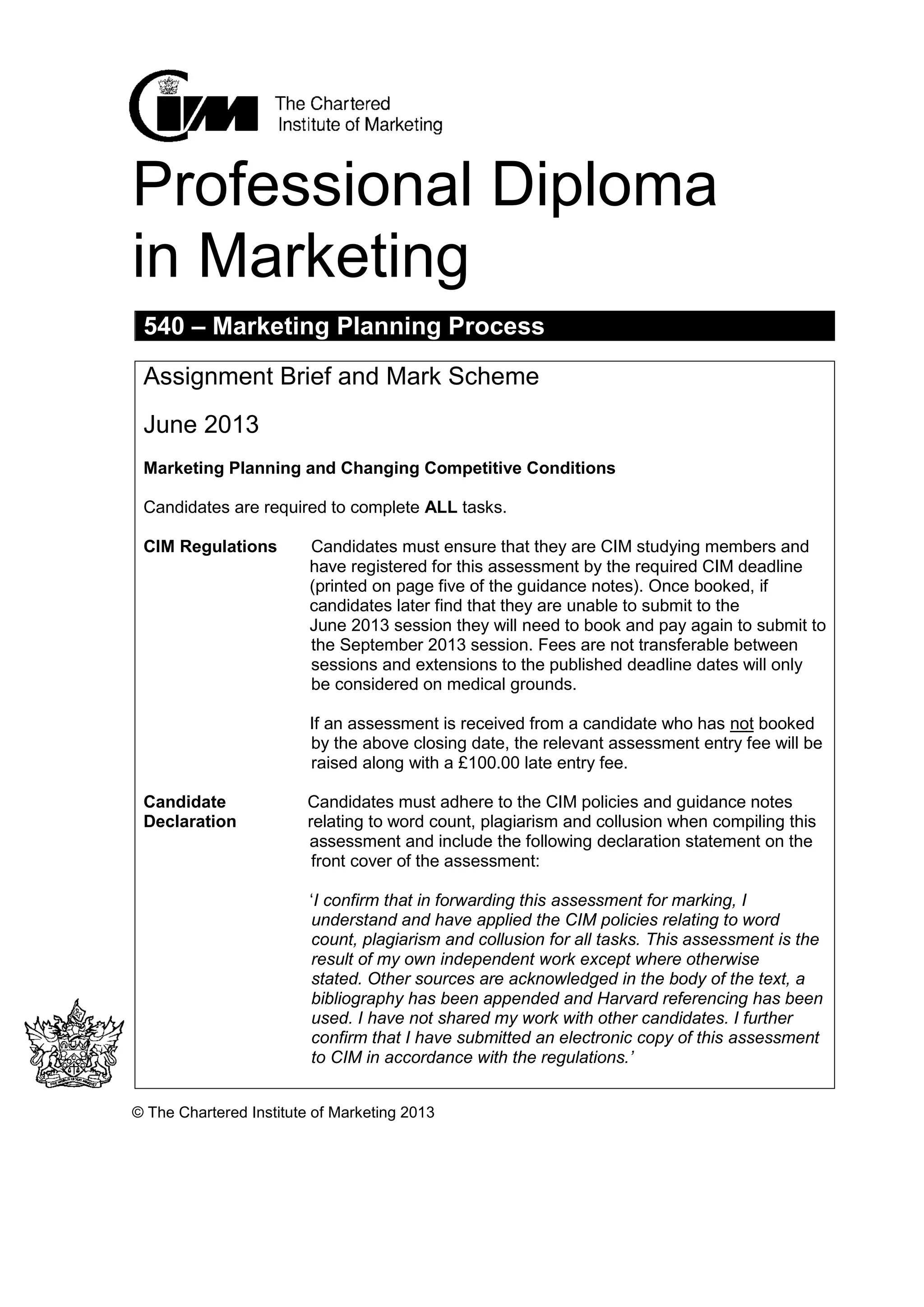 This document provides guidance and regulations for candidates completing the Professional Diploma in Marketing assessment on marketing planning. It outlines that candidates must be registered CIM members and adhere to word count, plagiarism and confidentiality policies. The assessment will be marked based on demonstration of concepts, application, evaluation and presentation skills based on a marketing plan for the candidate's organization. Tutors can provide limited feedback but not complete assessments.
