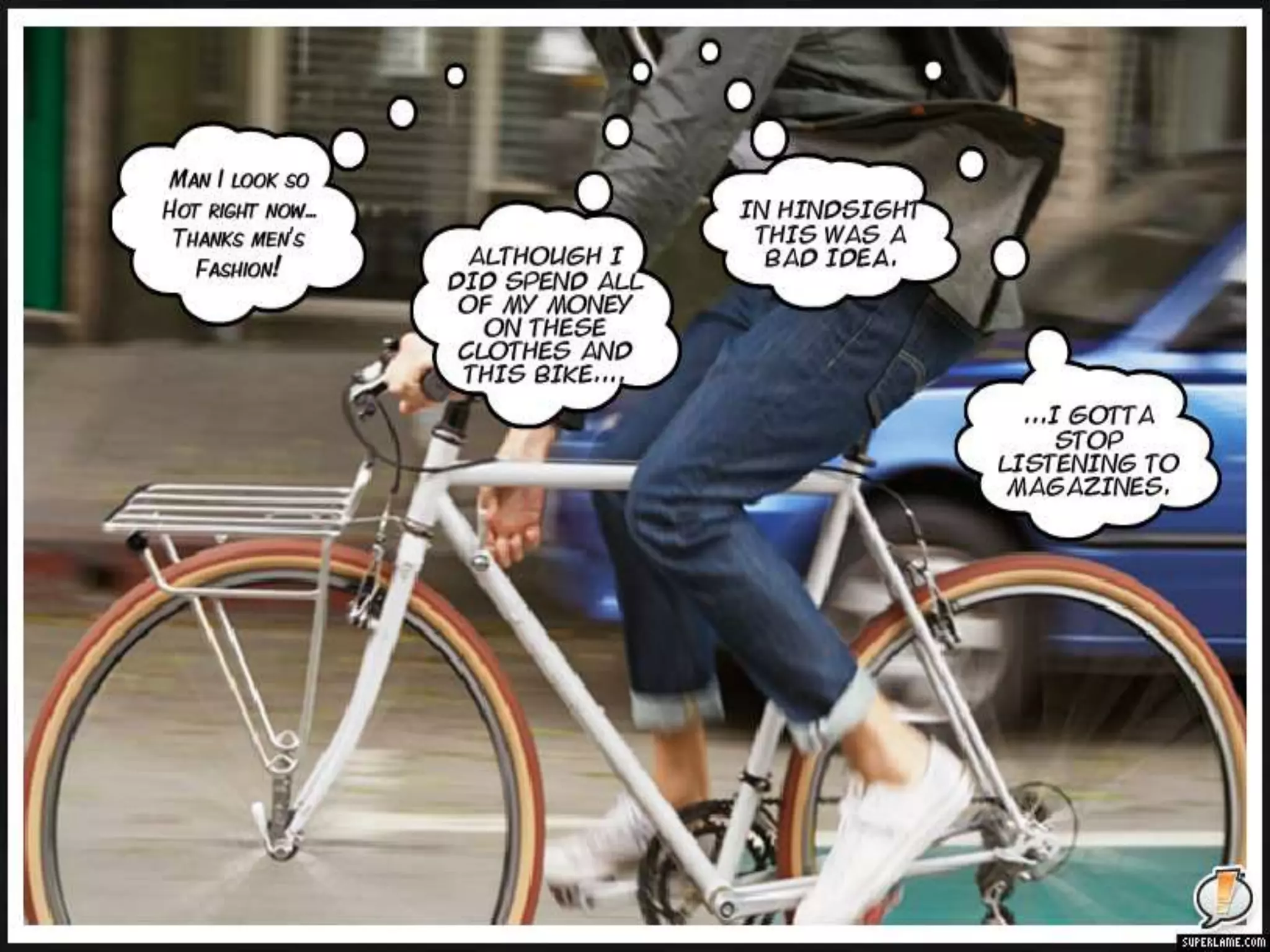 This document provides retail prices for various men's products promoted for their quality and usefulness. It summarizes items including a $289 backpack, $125 shirt, $280 denim jacket made with polar bear tears, $80 underwear that must cost over $40, $190 pants with special pockets, a $400 watch that tracks health data, $180 shoes that clip to bikes and promise better sex, a $650 bike described as necessary, an $80 helmet to protect against physical and mental threats, and $190 cordless headphones.