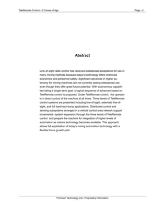 This document discusses advances in teleremote control systems for mining equipment. It describes three levels of teleremote control - line-of-sight control, extended line-of-sight control, and full load-haul-dump control. Line-of-sight control allows the operator to control equipment from up to 200 meters away if they have direct line of sight. Extended line-of-sight control uses more advanced controls and feedback to allow operation beyond direct line of sight. Full load-haul-dump control provides the capability for remote control of the entire loading and hauling cycle without requiring autonomous operation.