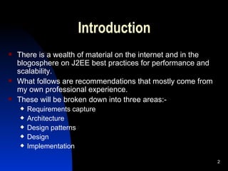 This document outlines best practices for performance and scalability in J2EE applications, primarily based on the author's experience with IBM WebSphere. It covers key areas including requirements capture, architectural design, and implementation, with specific attention to avoid distributed architectures, the importance of caching, and leveraging design patterns for efficiency. The document also emphasizes the need for a balanced approach between maintaining code elegance and achieving performance, alongside recommendations for practical implementation strategies.