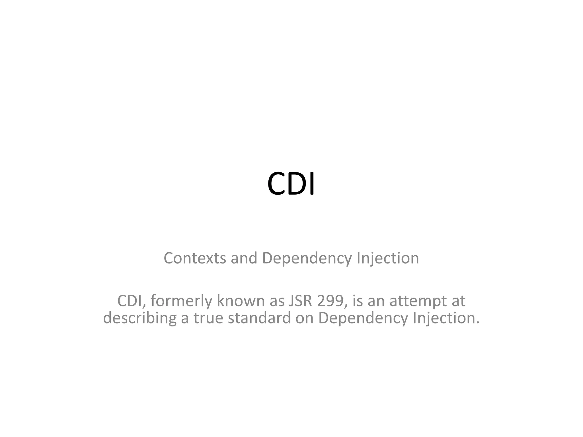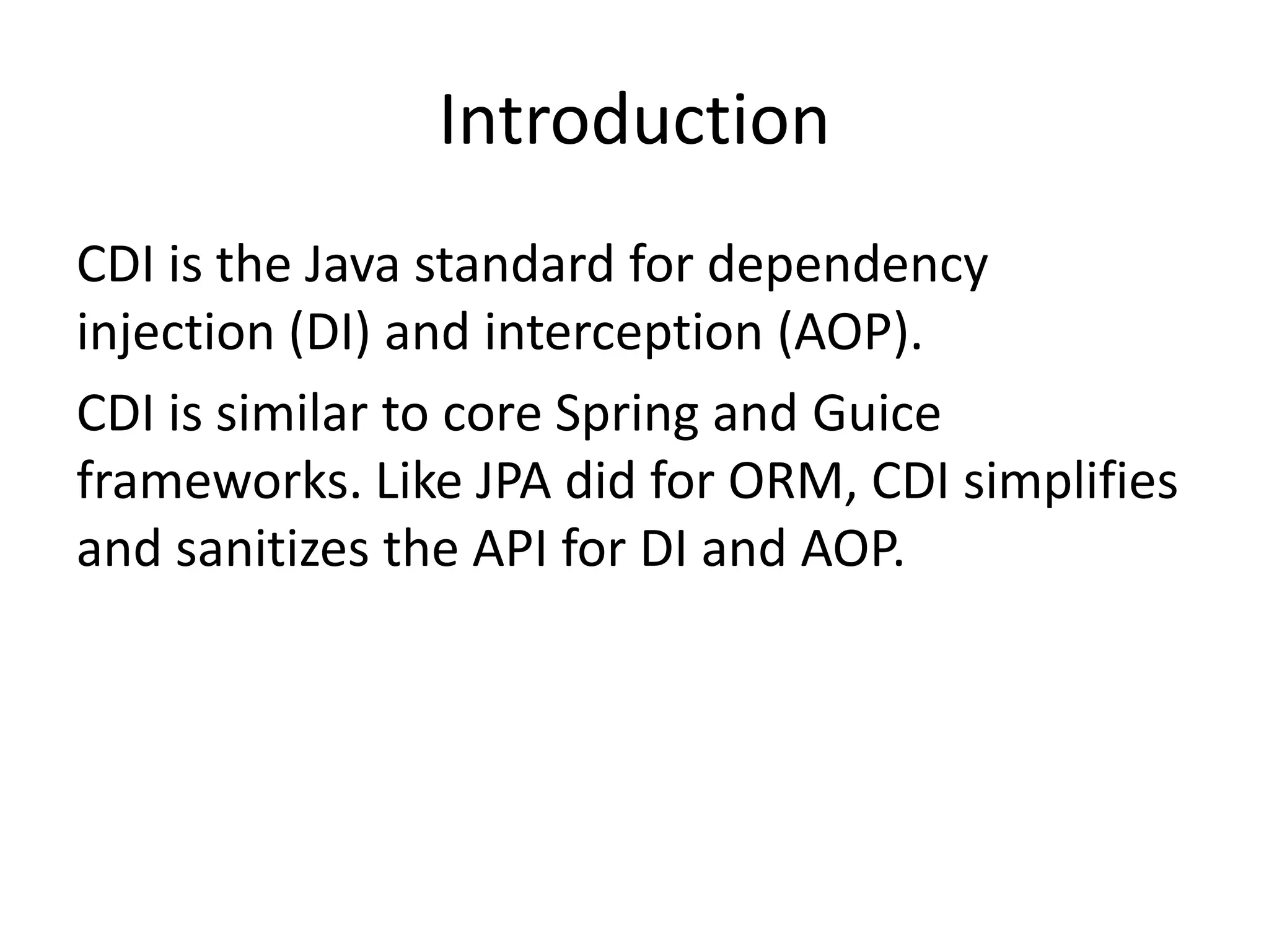 CDI (Contexts and Dependency Injection) is the Java standard for dependency injection and interception. It simplifies and standardizes the API for DI and AOP similar to how JPA did for ORM. CDI uses annotations like @Inject and @Produces to manage dependencies between classes and allows for features like interceptors and decorators. While part of Java EE, CDI can also be used outside of a Java EE container.
