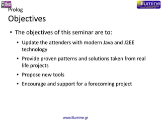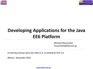 This document outlines the objectives, organization, prerequisites, tools, and schedule for a 5-day training seminar on developing applications for the Java EE6 platform given by Michael Mountrakis of Illumine.gr for MOU S.A. The seminar aims to update attendants on modern Java and J2EE technology, provide proven patterns and solutions, and propose new tools. It is organized with theory and lab portions each day and uses tools like Eclipse, JBoss, Tomcat, and Glassfish. The schedule covers topics like XML, web services, REST, generics, collections, JDBC, Spring, ZK web interfaces, and includes a case study project.