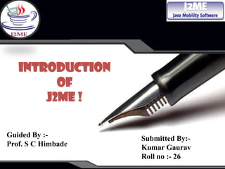 The document provides an overview of J2ME (Java 2 Micro Edition), which is a version of Java designed for small, resource-constrained devices. It discusses what J2ME is, the motivations for its creation, its core concepts including configurations, profiles, and optional packages, and how to get started developing applications using J2ME. The document serves as an introduction to the J2ME platform for developing applications on devices such as mobile phones, PDAs, and other small computing devices.