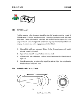 Dokumen ini memberikan pemahaman tentang kilasan aci bagi bar bulat, termasuk persamaan kilasan dan momen luas kedua kutub untuk aci padu dan geronggang. Pelajar diharapkan dapat menyelesaikan masalah berkaitan kilasan dan tegasan ricih maksimum. Beberapa contoh kirakan juga disertakan untuk mengukuhkan konsep yang dipelajari.