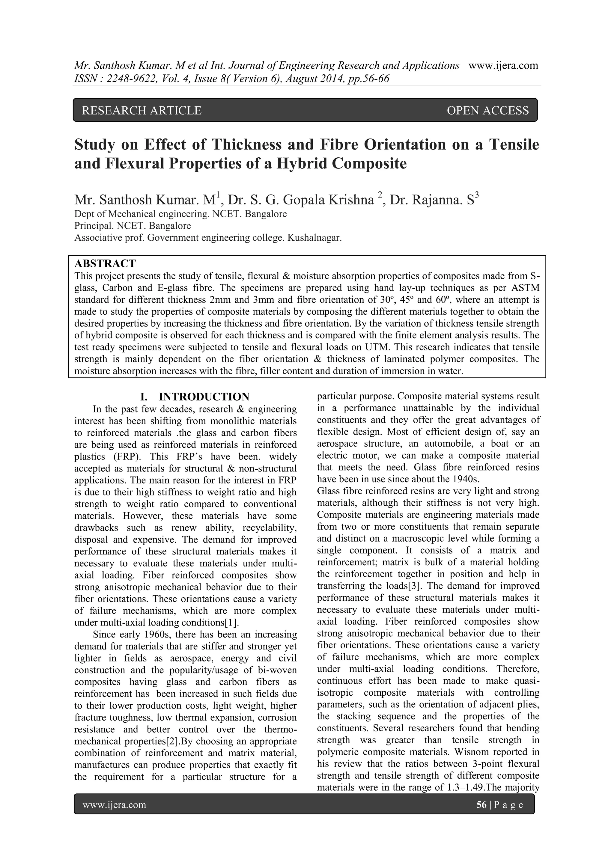 This document presents a study on the effect of thickness and fiber orientation on the tensile and flexural properties of a hybrid composite made from S-glass, carbon, and E-glass fibers. Specimens of different thicknesses (2mm and 3mm) and fiber orientations (30°, 45°, 60°) were prepared and tested according to ASTM standards. The test results showed that tensile strength was dependent on fiber orientation and thickness. Specifically, tensile strength increased with thickness and was highest at a 30° fiber orientation for both the 2mm and 3mm specimens.