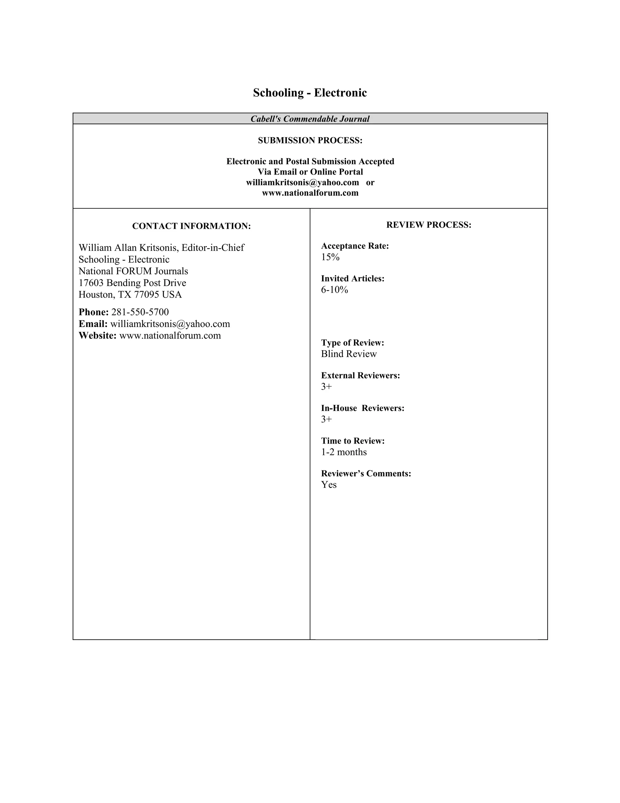 Schooling is an electronic journal accepting submissions via email or an online portal, with an acceptance rate of 15%. The review process includes blind reviews by external and in-house reviewers, and manuscripts are published through the National Forum Society of Educators. The journal covers a wide range of educational topics and is accessible to a global readership of educators and researchers.