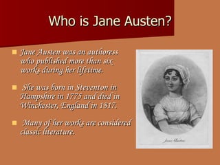 Jane Austen was an English author who lived from 1775 to 1817 and published six major works during her lifetime that are now considered classics of English literature. Some of her most famous novels include Pride and Prejudice, Sense and Sensibility, Emma, and Northanger Abbey. Her novels typically dealt with themes of love, marriage, and family among the middle class in late 18th century England.