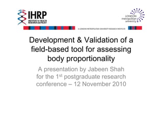 This document summarizes the development and validation of a new field-based tool for measuring body proportionality among children. It was created by Jabeen Shah for a postgraduate research conference. The tool aims to provide a lightweight, portable, and inexpensive alternative to current laboratory measures of sitting height and leg length ratios, which are markers of obesity, diabetes, and cardiovascular disease risk. Initial results found the adapted measure to have high validity and reliability compared to standard measures, with a low coefficient of variation, suggesting it is suitable for use in field studies.